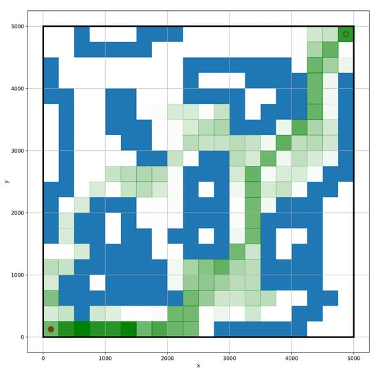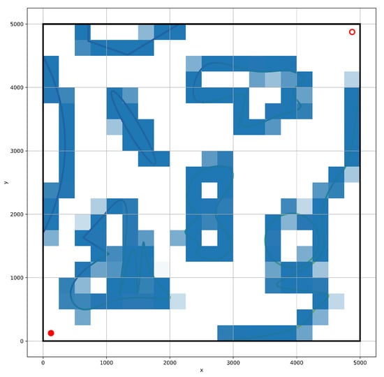 Smoothing is performed by including kinematics and curvature constraints on map obstacles. The final grid map is set to the resolution of 5 m/cell, as shown in Figure 3. The initial position is set at , and the initial pose is defined as facing to the right, as shown in the red dot (lower left corner) in the figure. The target position is set at , as shown in the red circle (upper right corner). The learning of the algorithm is mainly related to the a priori map and the starting point. The changing endpoint is always suitable for the cumulative error map to complete the learning and obtain the ideal path.