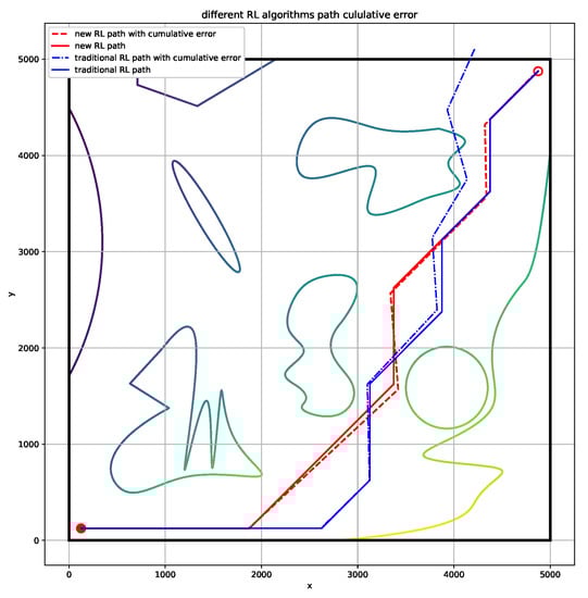 In general, the robot can accurately reach the end-point through the tracking process, with the help of high-precision GPS. In GPS-denied scenarios, considering the cumulative error originated from the noisy odometry sensors, with the distribution of and in both range and angular, respectively. As a result of the traditional reinforcement learning plan, the path can reach the end perfectly. At the moment, the reward/penalty is set to , and is set to . However, considering the influence of the above-mentioned sensor noise, the actual path of the robot will deviate from original path and end-point to a large extent, as shown in Figure 4. The solid red path is originally planned and the red dotted path is one affected by the accumulated error. The cumulative error in paths with many turns is relatively large. In a scenario where the robot only relies on odometry, it is easy to deviate from the predetermined path.