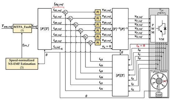 When phase A is open-circuited, its current (iA) is nullified. The conventional RFOC scheme used for healthy mode can be preserved in faulty mode as presented in Figure 1. However, new reference phase currents iref need to be determined to obtain smooth torque. Conventionally, from a given reference torque Tem_ref, MTPA strategy [,] or [] can be used to calculate optimal currents in faulty mode. The reference phase currents are then transformed into d-q frames idq_ref. Speed-normalized NS-EMFs and Park transformations are calculated with the rotor position θ from an encoder. Six PI controllers are used to control six reference d-q currents, generating voltage references. These voltage references are used to generate switching signals for a voltage source inverter (VSI) using the carrier-based pulse width modulation (PWM) strategy.