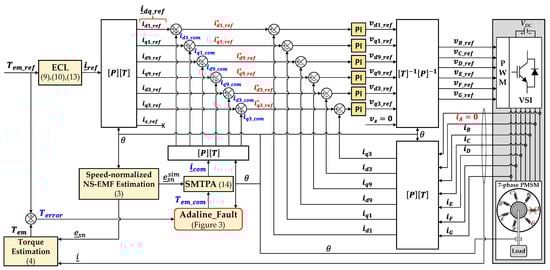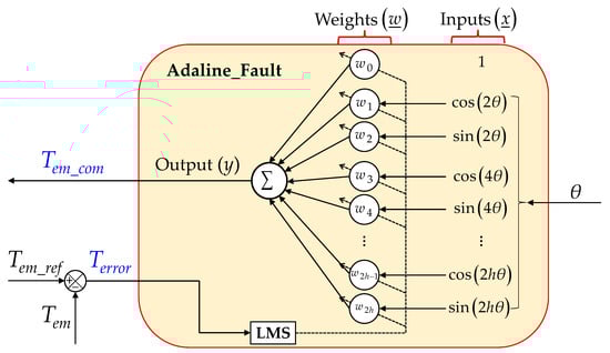 The proposed control scheme for faulty mode described in Figure 2 is based on the conventional RFOC scheme, an Adaline, and ECL strategy. New reference currents are determined by using ECL strategy as described in (9), (10) and (13) to generate an average torque Tave equal to Tem_ref. Then, compensating currents are adaptively added to identical waveform phase currents of ECL to eliminate torque ripples. Therefore, phase current waveforms are no longer identical but similar, leading to similar copper losses in the remaining healthy phases. These compensating currents are determined from the compensating torque Tem_com that contains all harmonics or main harmonics of the torque in Table 2. This compensating torque is determined by an Adaline (“Adaline_Fault”) that will be described in the next subsection. The total torque Tem is calculated from measured phase currents and estimated NS-EMFs according to (4).