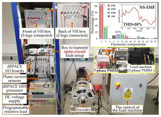 Experimental test bench and the multi-harmonic NS-EMF spectrum of the seven-phase PMSM to validate the proposed control scheme using Adaline_Fault and ECL strategy in faulty mode.