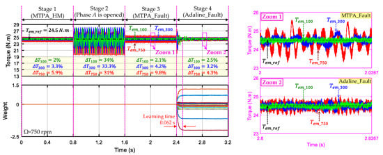 Figure 5 presents the torque performance in the four operating states at 100 rpm, 300 rpm, and 750 rpm (rated speed). The RFOC scheme using MTPA_HM in stage 1 (healthy mode) has a torque ripple within 2% (100 rpm) and 5.9% (750 rpm). When phase A is open-circuited, the torque ripple becomes higher than 30%. Therefore, the RFOC using MTPA_Fault and the proposed scheme using Adaline_Fault are then applied. At low speed (100 rpm), both schemes have low torque ripples (only 2.1% for MTPA_Fault and 2.5% for Adaline_Fault). However, the torque ripple with MTPA_Fault increases to 9.8% at 750 rpm (see stage 3 and zoom 1). Meanwhile, the torque ripple with Adaline_Fault slightly increases to 4.3% at 750 rpm (see stage 4 and zoom 2). A learning rate η of 0.0003 is used to update 23 weights of Adaline_Fault, leading to a learning time of 0.062 s. With adaptivity, the proposed scheme has higher torque quality compared with the conventional RFOC scheme with MTPA_Fault. The summary of numerical torque ripples in stages 3 and 4 is described in Table 4.