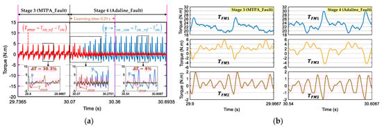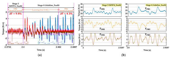 Figure 6a presents the learning process within 0.062 s at 750 rpm to eliminate Terror, the difference between Tem_ref and Tem. When the Adaline output y converges to the compensating torque Tem_com, Terror is minimized to reduce the torque ripple from 9.8% to 4.3%. Torques generated by the three fictitious machines in stages 3 and 4 are presented in Figure 6b. Notably, torque harmonics in FM1, FM2, and FM3 eliminate each other in both stages. Torques with MTPA_Fault have more harmonic components than those of Adaline_Fault. The proposed explanation for this difference is that MTPA_Fault is a compensation with additions of harmonics to different d-q frames by using all harmonics of NS-EMFs in (5). With Adaline_Fault, the compensation is directly calculated at the level of torque with its harmonic components. In addition, as Adaline_fault is online-trained, reference currents are adaptively generated to eliminate torque ripples.