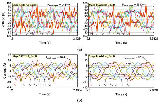 (Numerical result) Voltages and currents at 300 rpm in stages 3 and 4 when phase A is opened: (a) phase voltage references; and (b) phase currents.