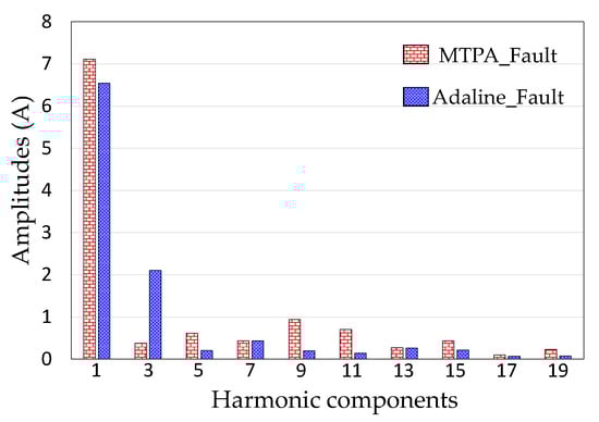 In addition, Adaline_Fault results in phase currents with lower amplitudes of high-order (≥5) harmonic components as described in Figure 8 for phase-B current. Therefore, iron and magnet losses with the proposed scheme using Adaline_Fault can be lower than those of the RFOC scheme using MTPA_Fault [,].