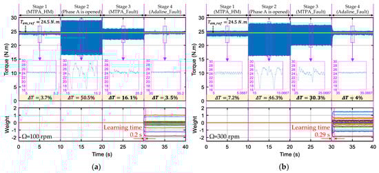 (Experimental result) The torque performance and 23 Adaline weights in the four operating stages in which stage 4 applies the proposed scheme using Adaline_Fault (η = 0.01) and ECL strategy: (a) at 100 rpm; and (b) at 300 rpm.