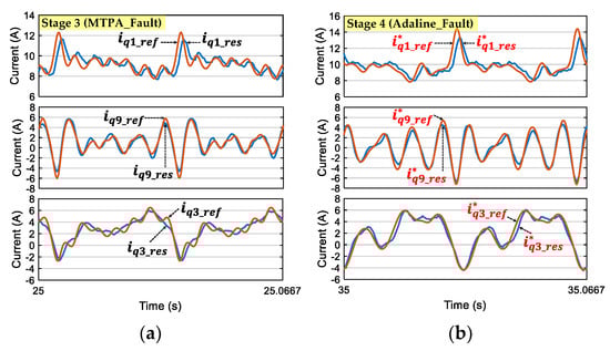The current control performance of q-axis currents at 300 rpm is described in Figure 11. It is noted that reference q-axis currents with MTPA_Fault have more high-order harmonic components than those of Adaline_Fault. Therefore, the experimental control performance with Adaline_Fault is better than that of MTPA_Fault, especially the control of q3- and q9-axis currents.