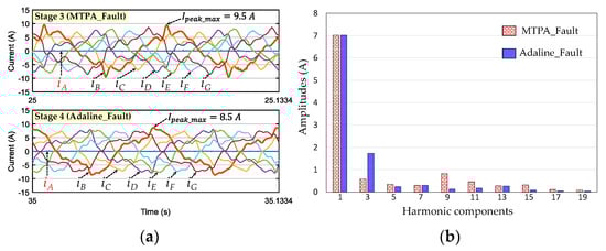 The experimental maximum peak voltage reference of phase B is in good accordance with the numerical results in Figure 7a, with 93 V for MTPA_Fault and 89 V for Adaline_Fault, leading to a higher speed range. Measured phase currents with MTPA_Fault and Adaline_Fault are described in Figure 12a. As numerical results, Adaline_Fault has a lower experimental maximum peak current (8.5 A) compared with MTPA_Fault (9.5 A). Adaline_Fault results in lower iron and magnet losses [,] thanks to lower amplitudes of high-order (≥5) harmonic components of phase currents (see Figure 12b for phase-B current). Experimental copper losses in the remaining healthy phases and the total copper losses in stages 3 and 4 are described in Table 5. As numerical results, experimental copper losses are similarly distributed in the remaining healthy phases with Adaline_Fault (from 1.51 to 1.79 pu). With MTPA_Fault, copper losses in the remaining healthy phases are significantly different (from 1.21 to 1.82 pu). However, the total copper loss of Adaline_Fault (1.38 pu) is 13.1% higher than that of MTPA_Fault (1.22 pu).