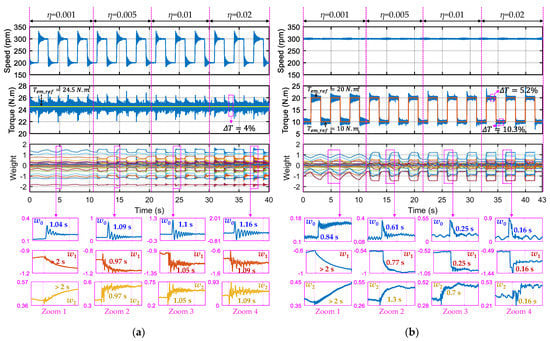 The dynamic performance of the proposed scheme using Adaline_Fault and ECL strategy in response to speed and torque variations is presented in Figure 13. These variations are arbitrary and have not yet been learned to test the robustness of the Adaline as well as the proposed control scheme. In addition, four values of learning rate η (0.001, 0.005, 0.01, and 0.02) are used to test Adaline convergence. Weights w0, w1, and w2 related to the main harmonics of torque ripples (T2θ) are zoomed in. The rotating speed variations between 200 rpm and 300 rpm have effects on torque quality as shown in Figure 13a with torque overshoots in transient states, especially with small values of learning rate. In steady states, the torque ripple is about 4%. When the learning rate increases to 0.02, the overshoots slightly decrease. Thus, weight variations can reduce the effect of the speed variation on torque. However, an increase in learning rate results in more oscillations of weights, leading to slightly longer learning time. When the reference torque varies between 10 N.m and 20 N.m at 300 rpm as shown in Figure 13b, the torque ripple increases from 5.2% to 10.3%. However, the torque quality is guaranteed because this ripple increase is due to the decrease in the average torque. Adaline weights are updated in each torque variation and remain almost constant at steady state. An increase in learning rate results in shorter learning time but higher overshoots appear.