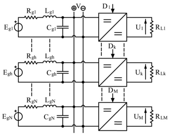 The first hypothesis is on the current loop of each DC-DC converter. As the current control bandwidth is supposed to be ten times larger than the voltage control bandwidth, the inner current loop is negligible as well as its dynamics effect. The second assumption is for each LC filter on DC load. When the Uk voltage is regulated by a first-order dynamics with ωk bandwidth, the k-filter does not affect the bus stability if ωk is sufficiently smaller than the filter’s resonance frequency ωfk. The load filter can be thus neglected as in [30,31]. A final condition is set by comparing voltage control bandwidths of generating/load DC-DC converters. If the ωh bandwidths are ten time smaller than the ωk ones, then the h-converters are assumed to operate in steady state condition. Consequently each h-filter is supplied by a constant voltage Egh (i.e., average value at h-converter output). Apart from the first hypothesis which is quite common in power electronics, the other two are synthesized as ωh << ωk << ωfk, then defining the range of validity. The complex DC microgrid can be simplified as in Figure 2 supposing that the three assumptions are verified.