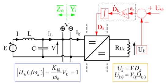 Since the Rgh filter resistors are practically ignored (i.e., small values), the N filters can be aggregated in a Thevenin equivalent circuit as in Figure 3. Now, the E equivalent voltage source feeds the LC parallel-resulting components, while the M voltage-controlled converters are clamped on the capacitor then supplied from the DC bus voltage. Each k-converter is feedback controlled to regulate the Uk voltage on RLk load, thus imposing the Uk0 reference in steady state condition. To simplify the analysis, the fast nonlinear switching dynamics of each converter is disregarded, thus resulting in average value models [9]. As the switching frequency is high, the converter dynamics is indeed negligible because the related pole is placed far beyond the considered field of study in the Gauss plane. Then, the controlled Uk output is given by the product between V average bus voltage and Dk duty signal (yellow box), while the equations with 0 subscript are in steady state. The duty cycle is the output of an integral regulator (dashed box), whose KIk gain imposes a first-order behavior as control target for the Uk output voltage. Once the converter dynamics are neglected, the open-loop transfer function Hk(s) is the cascade of the integral regulator and V0 gain. The KIk value is set for the 0 dB crossing in ωk bandwidth (blue box). Finally, the IL total current is the sum of M input currents Ik. Thanks to above mentioned assumptions, now 2 + M state Equation (1) model the filtered DC microgrid supplying M voltage controlled converters. The first two equations are apparent, the third is defined in Figure 3. Here, Dk first derivative is determined from the red scheme, while Uk, Uk0 and Kik are in yellow/blue box. In the last equation, the M load currents are moved at the converters inputs (i.e., Dk action) to get the total IL. For a small-signal stability study, Equation (1) is linearized in a stable equilibrium point given by 2 + M rated values (V0, I0, Dk0). The model in (2) is then processed by the Laplace transform to find functions V(s) and IL(s), as in (3)–(4). Output impedance Zo(s) and input admittance Yi(s) are in (5), where ω0 = (LC)−0.5 is the equivalent filter’s resonant angular frequency. As in [36,37,38,39,40,41,42], the system stability is evaluated on T(jω) = Zo(jω)·Yi(jω). Thus, Equation (5) is combined in (6) to define the real-imaginary part of T(s), where Gk = Dk02/RLk is the k-conductance and ω the angular frequency.