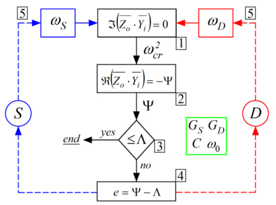 By considering Equation (20), the simple iterative process of Figure 4 is developed for two targets. First, the stability behavior of the WBM-based model is evaluated when ωS and ωD are initially defined. Subsequently, the process could be used to properly redefine the two control bandwidths if the initial assessment proved the instability. The first step of the iterative process finds the square ωcr (21), once assigned power system data (green box) and control bandwidths (red/blue boxes). Then, the square ωcr is substituted in (20b) to determine the real coordinate ψ at step 2. This value is compared to the stability target Λ at step 3. When ψ ≤ Λ, the process is stopped as the stability is certainly ensured being Λ ≤ 1 by definition. Conversely, when ψ > Λ the iterative process (dashed lines) can also redesign ωS and ωD to lower the ψ till the Λ value. As the DC stability is impaired by large bandwidth controlled loads [30,31], the iterative process applies a bandwidths reduction to recover the stability requirement. To follow this strategy, the error e is at first determined as ψ−Λ (step 4). Then, both blue and red paths (step 5) can minimize e, then forcing a position near the point (−Λ, 0). By focusing on the blue process, the error is the information to reduce step-by-step the ωS. As this bandwidth gradually decreases at each iterative cycle, the error e similarly moves towards zero. When e is smaller than a threshold (e.g., 10−3), the related ωS is thus able to assure the target Λ. Similar considerations are used for the red path, while lowering the ωD. The basic idea of the iterative process is considered as an advantage, as its application results also simple as a consequence. A complex process to establish the stability performance would be less useful when pursuing the effective implementation in the marine operative context. Moreover, the tuning (i.e., up/down) on ωS and ωD is definitely an effective, although elementary, approach to reaching the stability goal, while preserving the dynamics requirements for as long as possible. Future research activities will be based on this redesign, thus introducing the possibility of smart tuning the control bandwidths.
