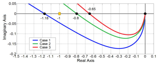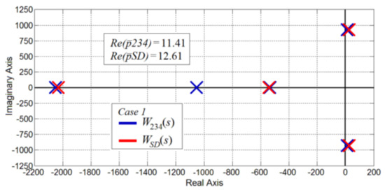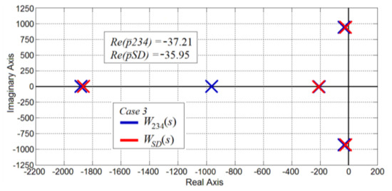Once the ωS-ωD aggregated bandwidths are defined as in Table 4, the iterative process of Figure 4 is run to establish the stability performance of each case. Particularly, the Nyquist diagram of Figure 5 highlights three intersections. The instability is made evident for the Case 1, where the perturbation is capable of imposing an intersection Ψ = 1.18 > 1. Conversely, the bandwidth reduction on ω2 (i.e., 500–200) in Case 2 is enough to ensure the system stability after perturbation (i.e., Ψ = 0.8 < 1). Finally, Case 3 where the additional reduction on destabilizing bandwidths (i.e., ω3 and ω4) is able to guarantee the best stability result (i.e., Ψ = 0.65 < 1). Being PD more than three times the PS, a tiny reduction (−8.6%) in ωD is sufficient to get the stability target in the last case. Finally, Figure 6 and Figure 7 show the poles of transfer functions W(s) from ΔE to ΔV (15) and (16), when load 1 is OFF in Case 1 and 3. In both cases, the aggregated complex poles SD are always slightly on the right of initial complex poles 234. By comparing their real parts, the relative errors (i.e., 10% in Case 1, 3.4% in Case 3) prove the less conservativeness of WBM stability assessment.