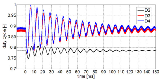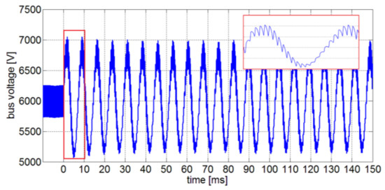 To prove the validity of the WBM stability assessment, a DC shipboard system with four voltage-controlled DC-DC converters (Table 1) is emulated by Typhoon HIL 604 real-time platform (Figure 8). The controlled DC grid is modeled by means of the Software-In-the-Loop approach, thus the system-control code is compiled to run real-time simulation where the detailed switching behavior is made visible. The four controlled DC-DC converters are synthesized in HIL schematic editor (Figure 8), where core coupling elements subdivide the numerical task in three cores. In such a way, the platform can offer real-time transients notwithstanding the small simulation time step (0.5 μs). In the HIL tests, a perturbation (i.e., disconnection of load 1) is applied at t = 0 s to establish the analyzed scenarios. First, the instability of Case 1 (Ψ = 1.18) results evident in Figure 9, where the bus voltage presents a limit cycle (range of ±17%) thus forcing the consequent intervention of protections. Conversely, the best stability performance (Ψ = 0.65) is highlighted in the Case 3 results (Figure 10, Figure 11, Figure 12, Figure 13 and Figure 14), confirming the stability assessment. Although the stability analysis disregards the presence of load filters, it results coherent with emulations, which on the contrary also considered the filtering stages. The control validity is confirmed on the bus voltage transient (Figure 10), where the rated value (6000 V) is restored in about 150 ms by an underdamped evolution. In a steady state condition, the peak-peak voltage ripple ΔV% results equal to 4% thus in accordance to the requirements in [9]. The controlled load voltages in Figure 11 also display a well-filtered behavior as the LC components on loads are sized to ensure ΔV% = 7%. Regarding the actuators, Figure 12 shows the duty cycle signals to impose a stable steady state condition on the bus voltage, while avoiding the saturation (i.e., Y-axis = 1). When the dynamics transient is concluded in t > 150 ms, the final duty values are greater than the rated Dnk (Table 1) to compensate for the voltage drop on filter resistances Rfk. The converter’s currents are in Figure 13 while Figure 14 shows the loads currents. In both transients, a settling time of 150 ms is visible. The currents in the filter inductors (Figure 13) exhibit ripples (ΔI% < 30%) in compliance with the desired power quality (Table 1), conversely smaller ripples (ΔI% ≈ 4%) are visible on loads currents (Figure 14).