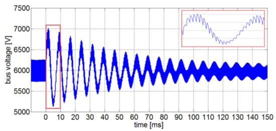 Bus voltage transient in Case 1 (each Y-division is 500 V in zoomed graph).