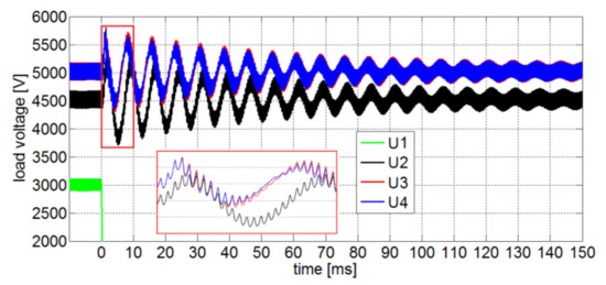 Load voltages transient in Case 3 (each Y-division is 500 V in zoomed graph).
