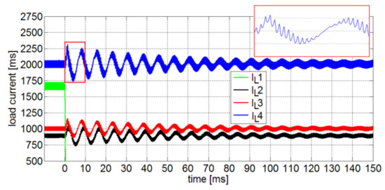 Load currents transient in Case 3 (each Y-division is 250 A in zoomed graph).