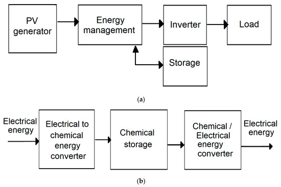 General scheme of connections between the solar panel and a storage unit. (a) Block diagram illustrating typical connection: PC cell—energy storage device—receiver, (b) block diagram of energy storage process within the battery.