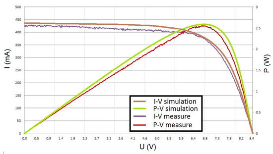 The simulation carried out giving I–V characteristics contributed to the preliminary findings of the assumed MPP (with P&O method) for the solar panel under construction. Finally, after the physical photovoltaic panel was constructed, measurements were carried out, which were compared with the results of the simulation (Figure 5).