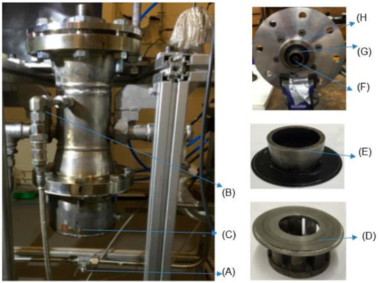 The 20-kW generic burner system: (A) working fluid intake, (B) fuel intake, (C) speaker container, (D) swirler, SN = 1.5, (E) swirler/burner nozzle, divergent angle = 90°, (F) diffusive injector, (G) swirl base, (H) confinement base.