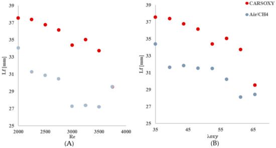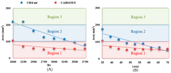 The results were limited by the [0–300] mm interval. This interval was divided into three equally spaced regions (i.e., region 1: [0–100] mm, region 2: [100–200], and region 3: [200–300]). Regions 1, 2, and 3 represent low, average, and high compared to the other recorded datapoint, respectively. As the datapoint transfers from region 1 to 3, it represents an increase in the highest heat intensity area. For those of the CARSOXY, flames were mainly focused in region 1, while concentrated in region 2 for CH4/air, indicating a more condensed area of highest heat intensity for CARSOXY compared to CH4/air. Remarkably, as the increases—Figure 3A—the difference in between both flames decreases (i.e., at , of CARSOXY is only 70% of that of CH4/air). The pattern for in Figure 3B approximately followed the same pattern as those at constant.