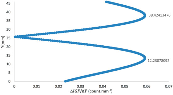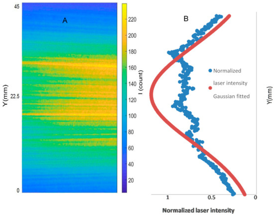 The Gaussian fit is utilized for laser sheet profiles because it provides a statistically symmetric representation of averaged sheet intensity with significant fluctuating components [20,23]. The absolute gradient and the Gaussian fit were plotted, as shown in Figure 3B and Figure 5, respectively.