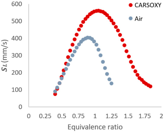 The of the CARSOXY was always greater than that of the CH4/air flame in all conditions, indicating more thin and uniform flames, and also thus indicating, moreover, that the rate of chemical reaction is faster than the characteristic flow velocity in comparison to CH4/air flames.