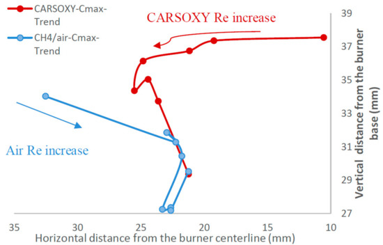 Nevertheless, as the working fluid flow rate increases (i.e.), of the CH4/air flame is less than that of the CARSOXY flame. However, as has been experimentally observed, further reduction in the of the CH4/air flame is only anticipated up to the of 85, since the flame blows out at this limit while the CARSOXY flame blows out at higher limits; thus can be further reduced.