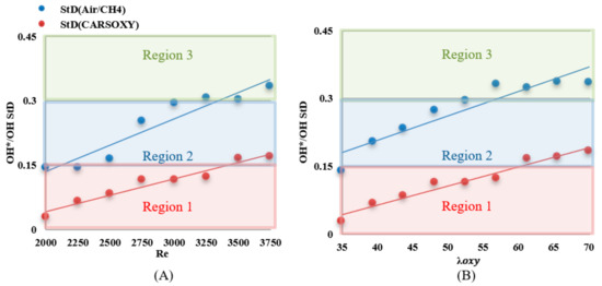 The results were limited by the [0–0.45] interval. This interval was divided into three equally spaced regions (i.e., region 1: [0–0.15], region 2: [0.15–0.3], and region 3: [0.3–0.45]). Regions 1, 2, and 3 represent low, average, and high heat release fluctuation compared to the other recorded datapoint, respectively. Figure 10A shows the standard deviation () of the heat release fluctuations () over the working fluid Reynolds number interval of [2000–3750] at of 1 L/min. As a datapoint transfer from region 1, which is limited by the interval of [0–0.15] to 3, it represents an increase in heat release fluctuation. Those of the CARSOXY flames were mainly focused in region 1 while concentrated in region 2 for CH4/air, indicating a more stable heat release trend for CARSOXY than CH4/air.