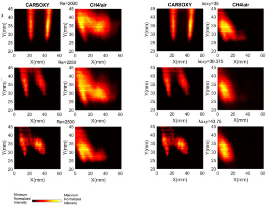 As mentioned in Section 2.4, the center of the highest heat intensity () was measured. However, the significance of those results—Table 4, Figure 8—is not necessarily to distinguish CARSOXY flame from the CH4/air flame. Instead, those results are used to highlight the effects of increasing the working fluid velocity (increasing the Reynolds number or ) on the and , thus justifying the modified versions of the Damköhler number and Borghi regime diagram, which take into account the working fluid velocity , as discussed in Section 2.6.