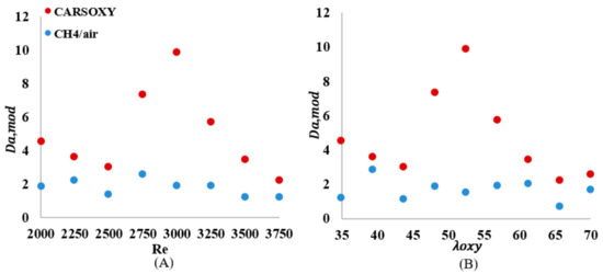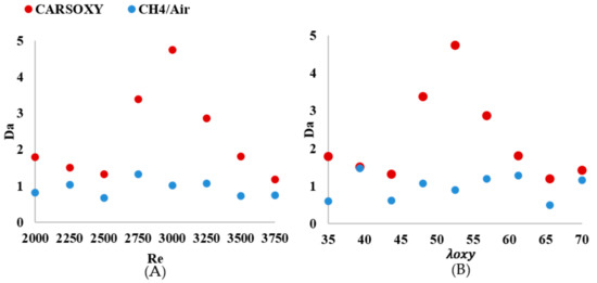As shown in Figure 12A, the of the CARSOXY is greater than one in all conditions, indicating thin uniform flames throughout the interval ([2000–3750]). This indicates that the rate of chemical reaction is faster than characteristic flow velocity. At, the CARSOXY flame showed the greatest . However, the rapidly decreases beyond (i.e., at ). On the other hand, the of the CH4/air flame was lower than that of the CARSOXY flame. In fact, at , and 3750, . The greatest combustion condition of the CH4/air flame was identified at , where. The patterns for the increase in—Figure 12B—generally followed the same behavior as in Figure 12A. However, at certain conditions (i.e., = 35, 43.75, and 65.625), the of the CH4/air flame was significantly low (i.e.).