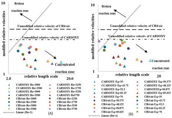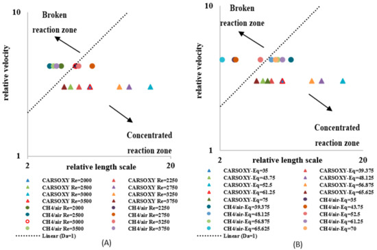 As discussed in Section 2, each flame type (CARSOXY and CH4/air) has its own laminar speed at stoichiometric conditions (i.e., = 559.2 mm/s and 398.837 mm/s for CO2-Ar-O2/CH4 and CH4/air flames, respectively). Since of the CARSOXY flame is higher than that of the CH4/air flame, the relative velocity of the CARSOXY flame was lower than of CH4/air. This shifted the CARSOXY data points below those for CH4/air and towards the concentrated reaction zone in the Borghi diagram, which was plotted for CARSOXY and CH4/flames at constant [2000–3750] and of 1 L/min (Figure 13A). Nevertheless, the CARSOXY flame also approached the concentrated reaction zone at high relative length scales (i.e., at = 3000, 3250, and 2750). The relative length scale to the relative velocity ratio patterns for the increase in —Figure 13B—generally followed the same behavior as those for the increase in the Reynolds number in Figure 13A. At, both the CH4/air and CARSOXY flames exhibit the highest tendency to approach the broken reaction zone.
