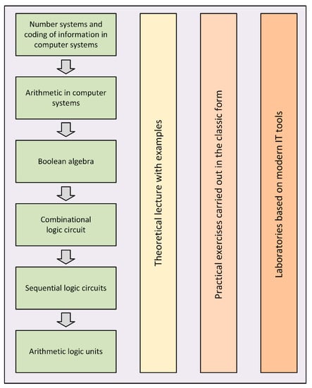 Modern technological development greatly influences the methods and means used in the didactic process. Nevertheless, each new tool needs to be tested in terms of its potential application to the transfer of specific educational content. The Rzeszow University of Technology educates, among others, IT engineers. The educational path dedicated to them also includes content on digital circuits under the subject name Elements of Logic and Computers Arithmetic. The course content is important not only from the point of view of the need for engineers to be familiar with the basic aspects of digital technology and its applications in the construction of modern computer systems, but also from the perspective of the general preparation of future engineers to address the needs of the job market, which must meet the needs of the Internet and its development, while the realization of Education 4.0 and Industry 4.0 concepts should also be taken into account. A general outline of the content of the course and the forms of education used is presented in Figure 1.