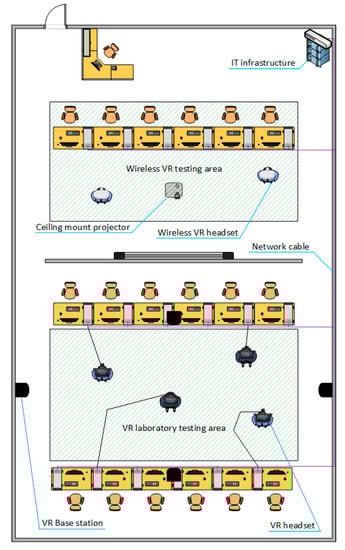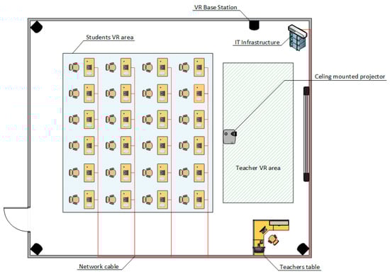 For the purpose of the lecture/exercise classes, a different room structure better suited to these forms of classes is suggested based on the auditorium scheme (Figure 3). In this case, both the presenter and the other participants can move to the VR environment at any time. The demonstrator guiding a given VR scenario (e.g., the teacher) can use a mobile zone to which they can invite selected students. The rest of the students use stationary stations equipped with VR goggles. The proposed approach allows for the efficient use of auditoriums and seamless switching between VR and real environments during the classes. It enables one to effectively use the various teaching methods and resources available today. However, it should be remembered that concept no. 2 has an exercise and lecture character—nonetheless, depending on the needs, it can also be applied to laboratory needs. If individual workplaces were equipped with workstations or high-powered mobile computers, it would be possible to perform part of the laboratory tasks on the basis of computer applications, and part in a VR environment—for example, as a final familiarization with the operation of the designed systems.