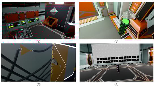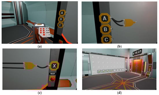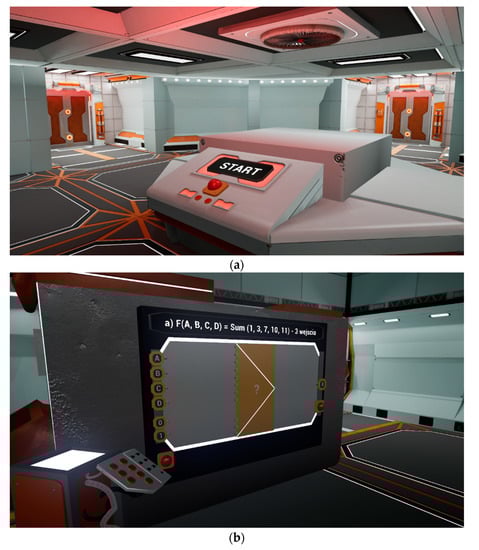Studies on various groups of people indicate that the acquisition of new skills and learning with the use of virtual reality is more effective than traditional methods [38,90]. A potential indicator of better learning results may be a full or significant user immersion connected to the prepared application or training course. In order to meet the challenges of the 21st century, as well as to develop a more digestible process of educating participants, the ELIAKI VR project was developed. It is an educational application using elements of computer game mechanics designed to familiarize students with the idea of digital circuits, their construction, logical implementation and application. The task uses virtual reality technology to provide the participant with the opportunity to work in a given environment using virtual simulations of both the environment and the design of logic circuits. An example of the ELIAKI VR application is presented in Figure 4a,b.