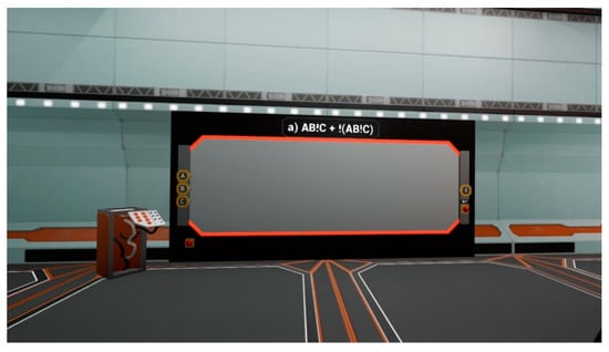 The third and final module was designed to familiarize the participant with the construction and operation of multiplexers. The final stage contained the solutions that the user learned during modules 1 and 2, including the construction of logic circuits and the use of a laser controller to select/mark the appropriate positions. The principle of module 3’s operation inherited the principles from modules 1 and 2. In the case of module 3, the participants, due to the time required to solve the task and the complexity of multiplexers in virtual reality, were familiar with the construction and principle of operation of an 8:1 multiplexer. At each level, the student had to take a dedicated item (Figure 9a), which by solving the task appropriately was produced and then delivered to a dedicated location to open the door to the next room (Figure 9b). The participant had all possible logic gates used in module one to send the appropriate signal to the signal inputs. The address inputs of the multiplexer had to be connected according to the task definition. The output signal from the multiplexer had to be connected to the signal input of the industrial machine (Figure 9c). In order to be able to program the given element, the task had to be solved first in the form of the canonical sum or product.