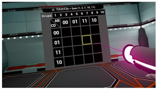 The second module was based on the use and application of truth tables known as Karnaugh maps and learning about function formula minimization techniques. The principles of the module were very similar to the first module, which made it possible to bypass the step of training students on how to use VR and navigate the application environment. The participant had to solve three sub-tasks from the main task, working with the same person as in module one at the same time. Each task was divided into two stages. The second stage was based on the solution of the first stage, and therefore it had to be performed correctly in order to complete the next stage. The goal of the exercise in the first stage was to properly complete the Karnaugh map based on the content of the quest (Figure 7).