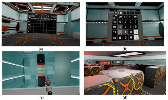 Module 2—Karnaugh maps: (a) a view of one of the tasks, (b) procedure of grouping minterms, (c) relaxation module for students, and (d) a virtual labyrinth as part of the in-game obstacles.