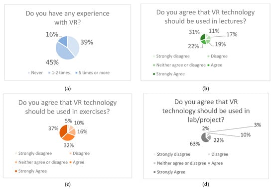Students’ survey results on experience with VR technology and its potential for different forms of education: (a) Q: Do you have any experience with VR?; (b) Q: Do you agree that VR technology should be used in: lectures; (c) exercises; (d) lab/project.