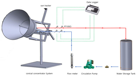 The conical concentrating system was mounted on a dual-axis tracking platform, which helps to maximize the available solar energy utilization. The experimental facility was located 37° latitude and 127° longitude.