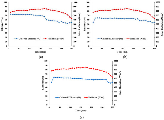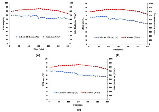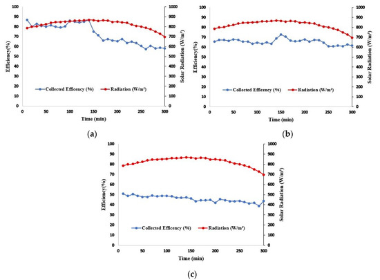 Collected efficiency using (a) Al2O3, (b) CuO, and (c) distilled water at 2 L/min.