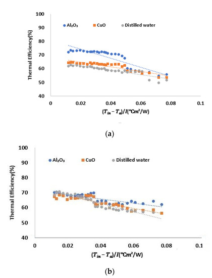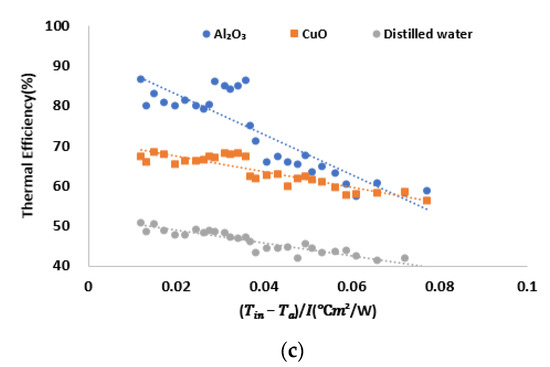 Figure 5 shows the results of analyzing the heat collection efficiency according to the change of (Ti − Ta)/I. As the temperature difference between the working fluid and the outside air temperature increases, the collection efficiency decreases. The decrease in efficiency is caused by convection heat losses between the absorber surface and the ambient air temperature. It is concluded that the present system had a higher efficiency in comparison with previously published results; nanofluids have shown better results as heating mediums compared with distilled water. In addition, the Al2O3 nanofluid was found to be more efficient than CuO nanofluids due to comparatively higher thermal conductivity.