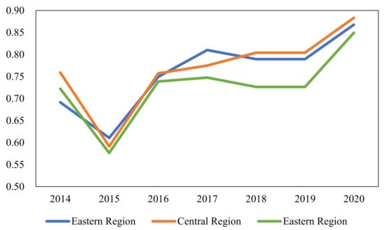 Considering that there is a certain regional agglomeration of hydrogen energy enterprises in China, and that their development may be influenced by the regional economic development, this paper further divided the enterprises according to different areas. It was found that the enterprises with higher financing efficiency are mostly located in the eastern coastal areas. According to the classification results, the number of enterprises in the eastern, central and western areas is 47, 13 and 10, respectively, including 15 in Jiangsu Province, 6 in Shandong Province, 6 in Guangdong Province and 6 in Zhejiang Province. They are all located in the eastern coastal areas, with strong local aggregation characteristics. As shown in Figure 2, it can be observed that the financing efficiency was higher in the eastern and central areas and lower in the western areas, which is in line with the economic development. Areas with relatively developed economic development are relatively more strongly supported by the government. The quantity and quality of investors in these areas are also relatively better. Therefore, enterprises in these areas face a better financing environment. According to the economic development and the agglomeration characteristics of enterprise development, China has also introduced a policy support program to reward the hydrogen energy demonstration city clusters by means of “awards and subsidies”. Recently, the “1+6” demonstration urban agglomeration was formed by six cities (areas), including Shanghai, Suzhou, Nantong, Jiaxing, Zibo, Ningdong and Ordos. Additionally, the Beijing-Tianjin-Hebei hydrogen fuel cell vehicle demonstration city cluster, led by Beijing, has been officially approved. It can be expected that it will create better conditions to improve the financing efficiency of enterprises in these demonstration urban agglomerations. Meanwhile, in a broader discussion, the better financing efficiency in the eastern coastal areas can be an advance of China in accelerating the shift towards a hydrogen economy in the Association of Southeast Asian Nations (ASEAN). For example, from the current development status of hydrogen energy industries in various countries, different utilization routes can be explored, including the application of green hydrogen in the transportation, power generation, industry and utility sectors together with Malaysia, the Philippines, Thailand and other emerging economies. Additionally, it can promote strengthening the ability of internal agglomeration and external radiation and further promote the development of ASEAN integration [36,37,38].