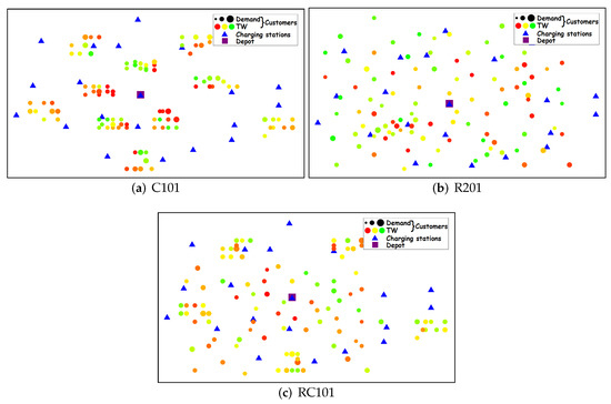 The materials include EVRPTW benchmark instances which consist of: (i) 56 large instances, each with 100 customers and 21 CSs, and (ii) 36 small instances, with 5, 10, and 15 customers per instance. The example of three instances is presented in Figure 1, where each customer is presented as a filled circle with two attributes: (i) size, which represents the demand of a customer—the greater the demand, the larger the circle, and (ii) color, from red to green, with red representing customers that close sooner (need to be visited sooner) and green representing customers that close later. The depot is represented with the purple rectangle, while the CSs are represented with blue triangles. In all instances, the Euclidean distance is used for distance computation. Each customer in an instance is directly reachable from the depot regarding the time windows, while regarding the energy, at maximum, two CSs are needed to visit each customer. Depending on the geographical distribution of the customers, instances are divided into three groups: clustered customer distribution (C) (example in Figure 1a), random customer distribution (R) (example in Figure 1b), and a mixture of both (RC) (example in Figure 1c). Additionally, the instances are divided into two groups based on the scheduling horizon: short scheduling horizon with narrow time windows (1) (examples in Figure 1a,c), and long scheduling horizon with wide time windows (2) (example in Figure 1b). For example, in instance named R201, R stands for random customer distribution, 2 for wide time windows, and 01 represents the instance number.