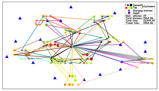 The example of BKS on EVRPTW-FR C101 instance is presented in Figure 4b, with in total 12 vehicles and total traveled distance of .