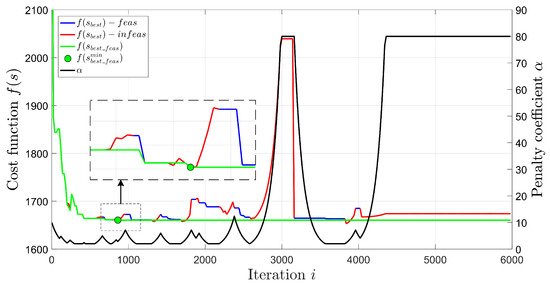 The example of a cost function during the search process when solving EVRPTW-FR on instance R101 is presented in Figure 3. The values of penalty coefficient are plotted with black color and presented on the right y axis. On the left y axis are the values of the cost function for the best solution (blue line for the feasible part and red line for the infeasible part), and best feasible solution (green line). The first occurrence of the best overall feasible solution is represented with a green circle. The update value of penalties is , and the penalties are updated every iterations. The cost value of the initial solution is . It can be seen that the feasible solution is rapidly improved at the beginning of the search, with occasional spikes. These spikes represent that the feasible solution with a lower number of vehicles is found and that it is accepted although it has a worse cost function value. When the best solution is infeasible but accepted due to the acceptance criteria (red lines), the penalty coefficient increases, while the opposite occurs when the best solution is feasible. In the zoomed part, it can be seen that allowing infeasible solutions can lead to better feasible solutions. Additionally, as the minimum best feasible solution is relatively quickly found (), in the rest of the search, the infeasible solutions are accepted, and penalties are updated to perhaps find a better solution.