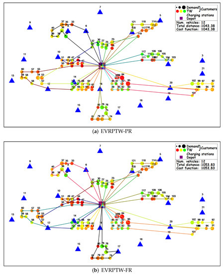 To see the influence of integrating BEVs in the goods delivery, the results are compared to the BKSs on Solomon VRPTW instances, downloaded from https://www.sintef.no/projectweb/top/vrptw/solomon-benchmark/ page (accessed on 9 December 2021). In total, the BKSs on VRPTW instances contain 405 vehicles and produce the total traveled distance of 57,186.88. Although the direct comparison is not entirely correct as some customers in VRPTW instances have relaxed time windows in EVRPTW instances [1], still some general conclusion could be drawn, that even with the relaxed time windows, the EVRPTW-PR produced % more vehicles and increased total traveled distance by %.