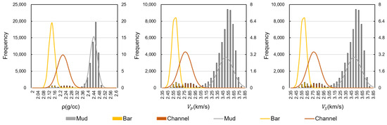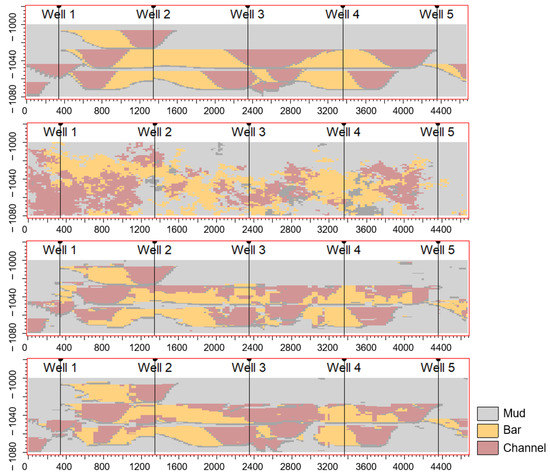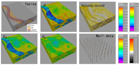 The meandering river model with a low curvature in the first layer of the Stanford VI-E reservoir was taken as the test object, which is a 150 × 200 × 80 model. The lithofacies were subdivided into point bar, channel, and floodplain mudstone deposits (Figure 2). The different microfacies have different elastic parameter distributions (Figure 3). By designing 68 virtual wells, the seismic inversion method was tested based on the given elastic parameters and the lithofacies interpreted from the well data. In order to verify the accuracy of the method, only 63 wells were selected as the condition wells, and the remaining five wells were used as the test wells to analyze the inversion results.