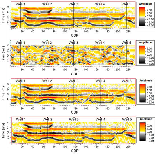 Seismic records obtained through well inversion (from top to bottom, real reservoir, TPI, MPI, and LPUMI).