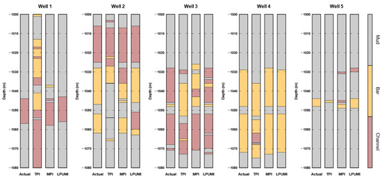 Lithofacies profiles of the five validation wells (from top to bottom, real reservoir, TPI, MPI, and LPUMI).